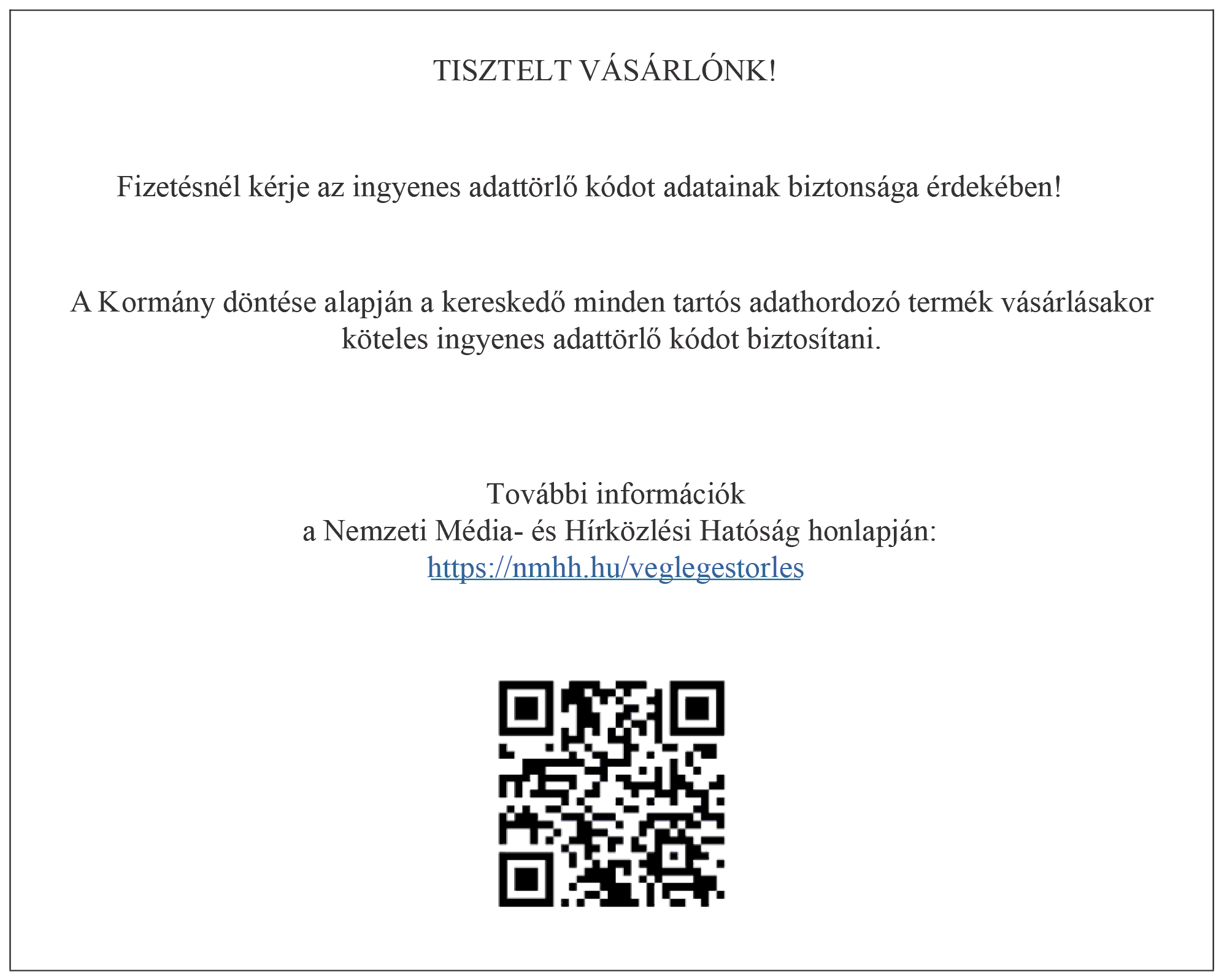 Fizetésnél kérje az ingyenes adattörlő kódot adatainak biztonsága érdekében!A Kormány döntése alapján a kereskedő minden tartós adathordozó termék vásárlásakor köteles ingyenes adattörlő kódot biztosítani.További információk a Nemzeti Média- és Hírközlési Hatóság honlapján: